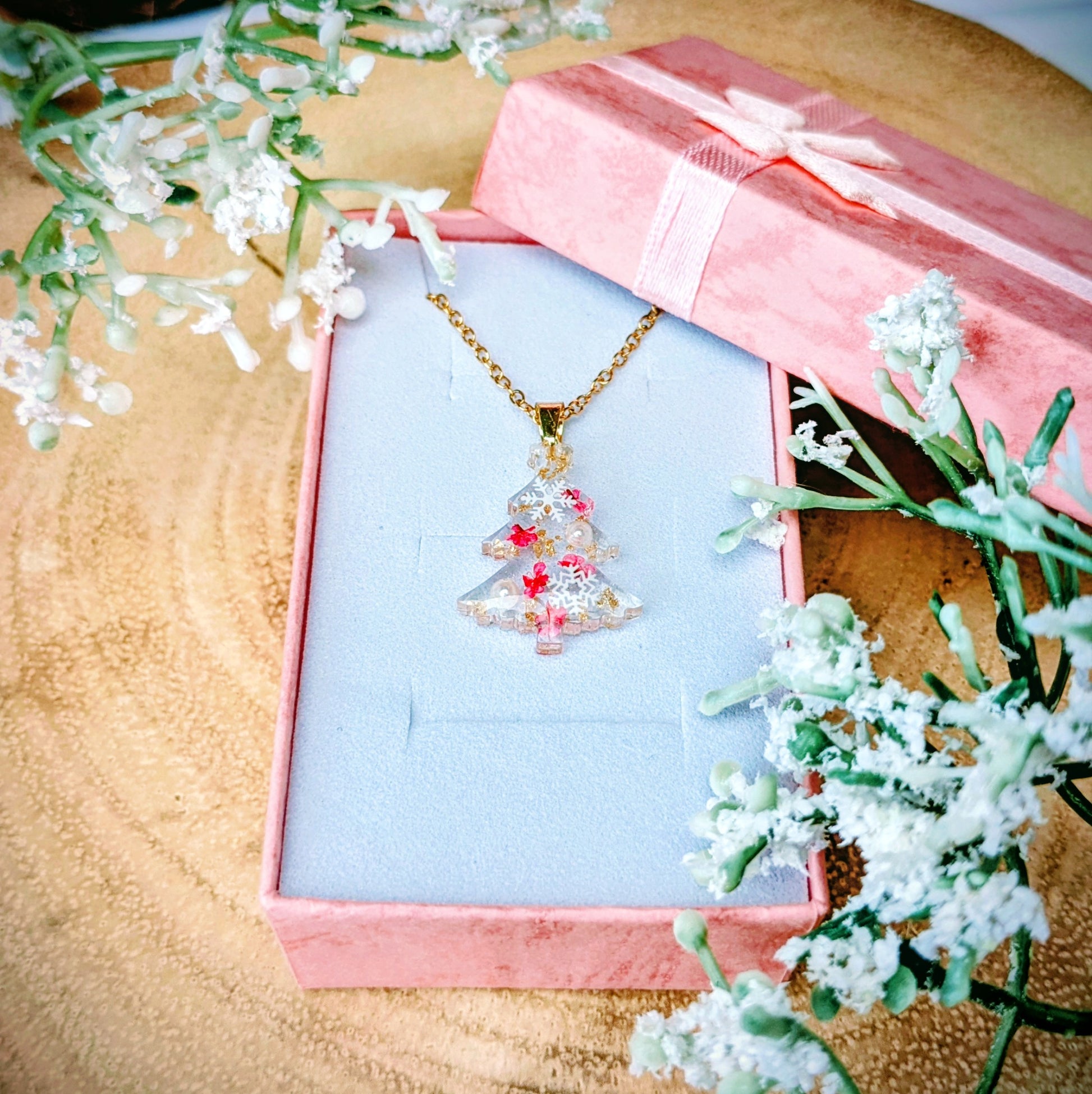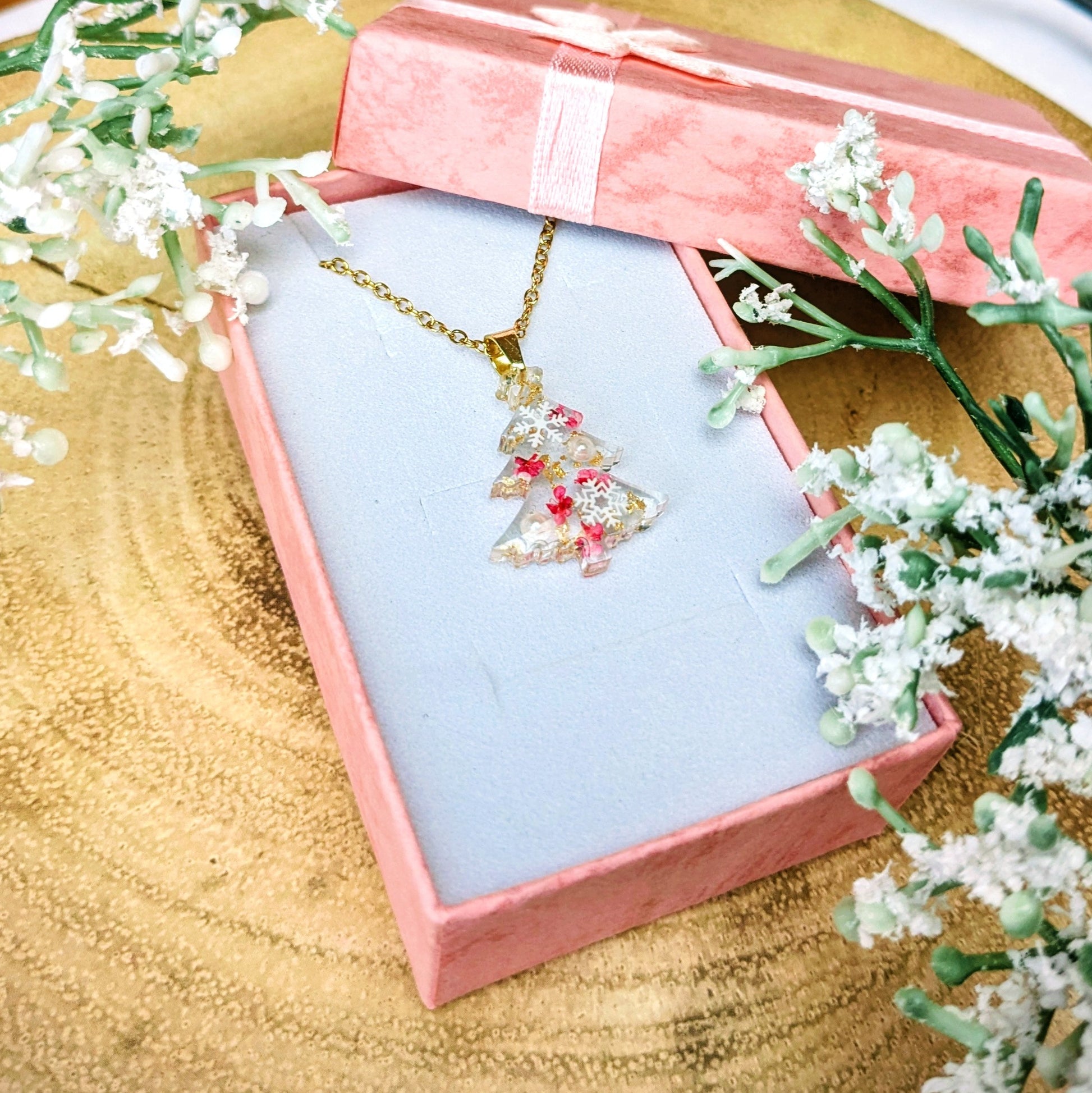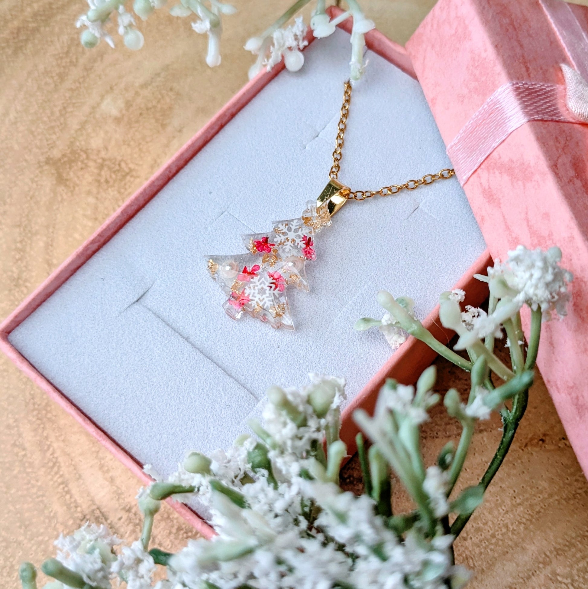 Beautiful little resin Christmas tree filled with real flowers , faux pearls and snowflakes with flecks of gold leaf.