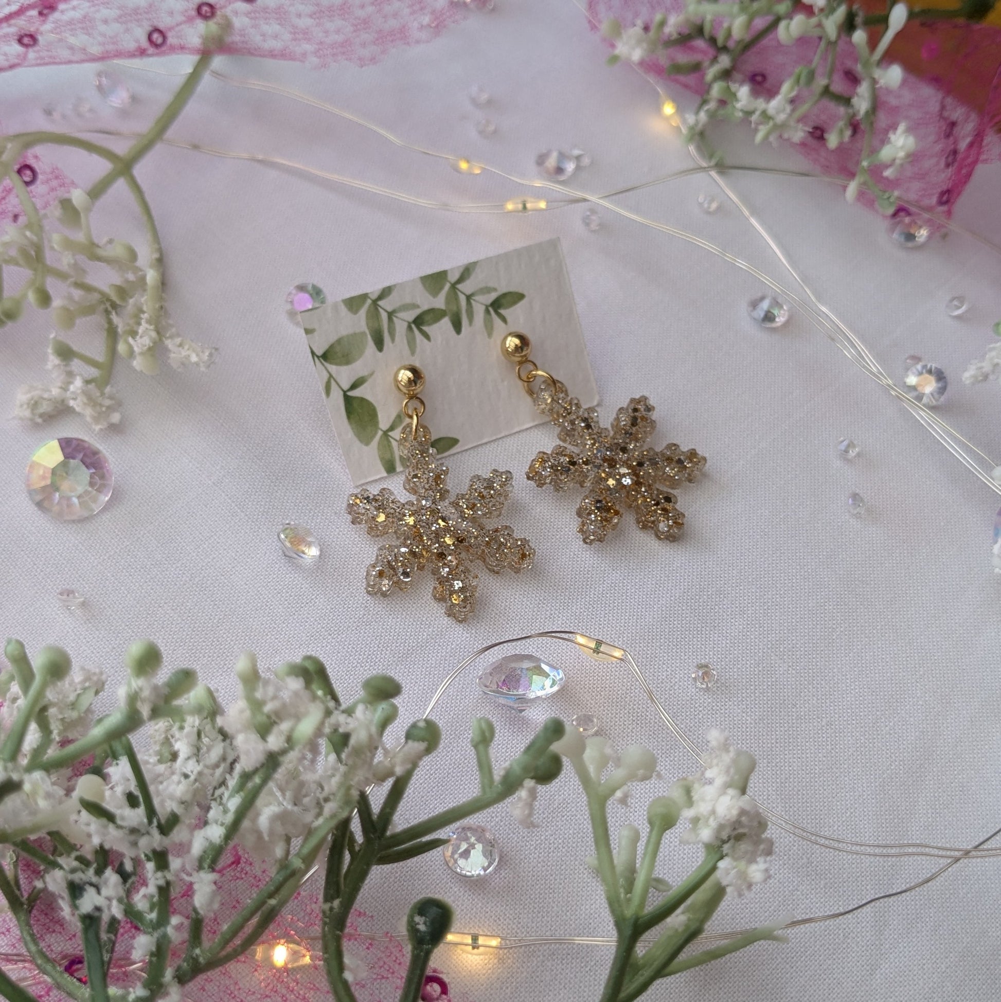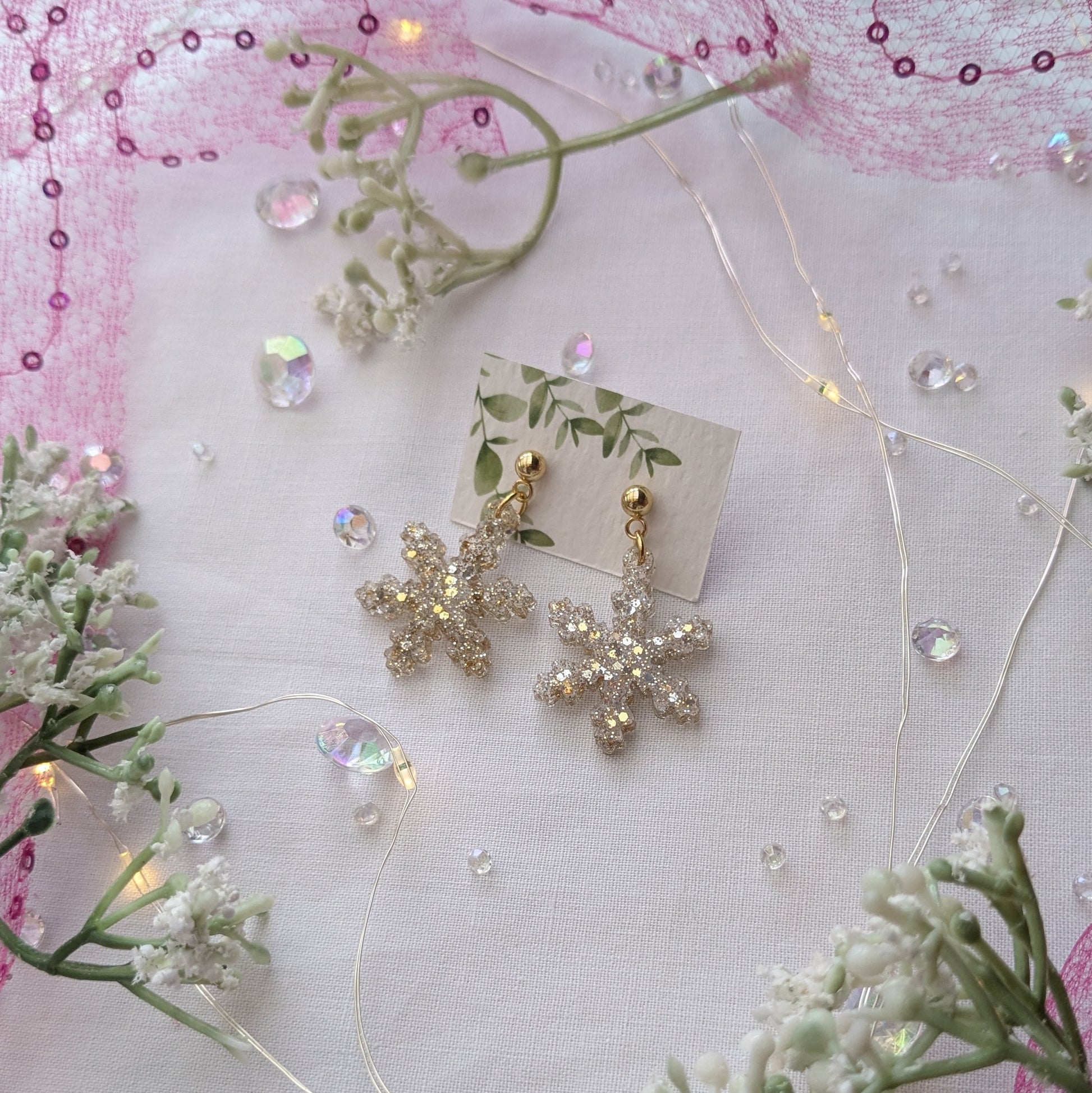 Glittery resin snowflake earrings hung on hypoallergenic stainless steel studs.