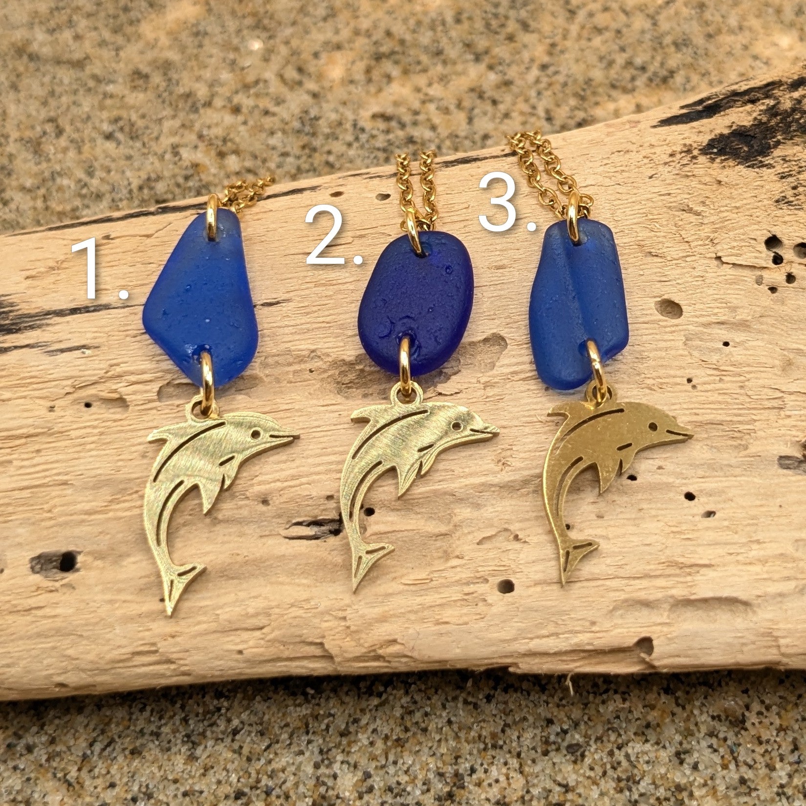 Make a splash necklace features blue Isle of Wight sea glass and a gold coloured hypoallergenic stainless steel dolphin charm.