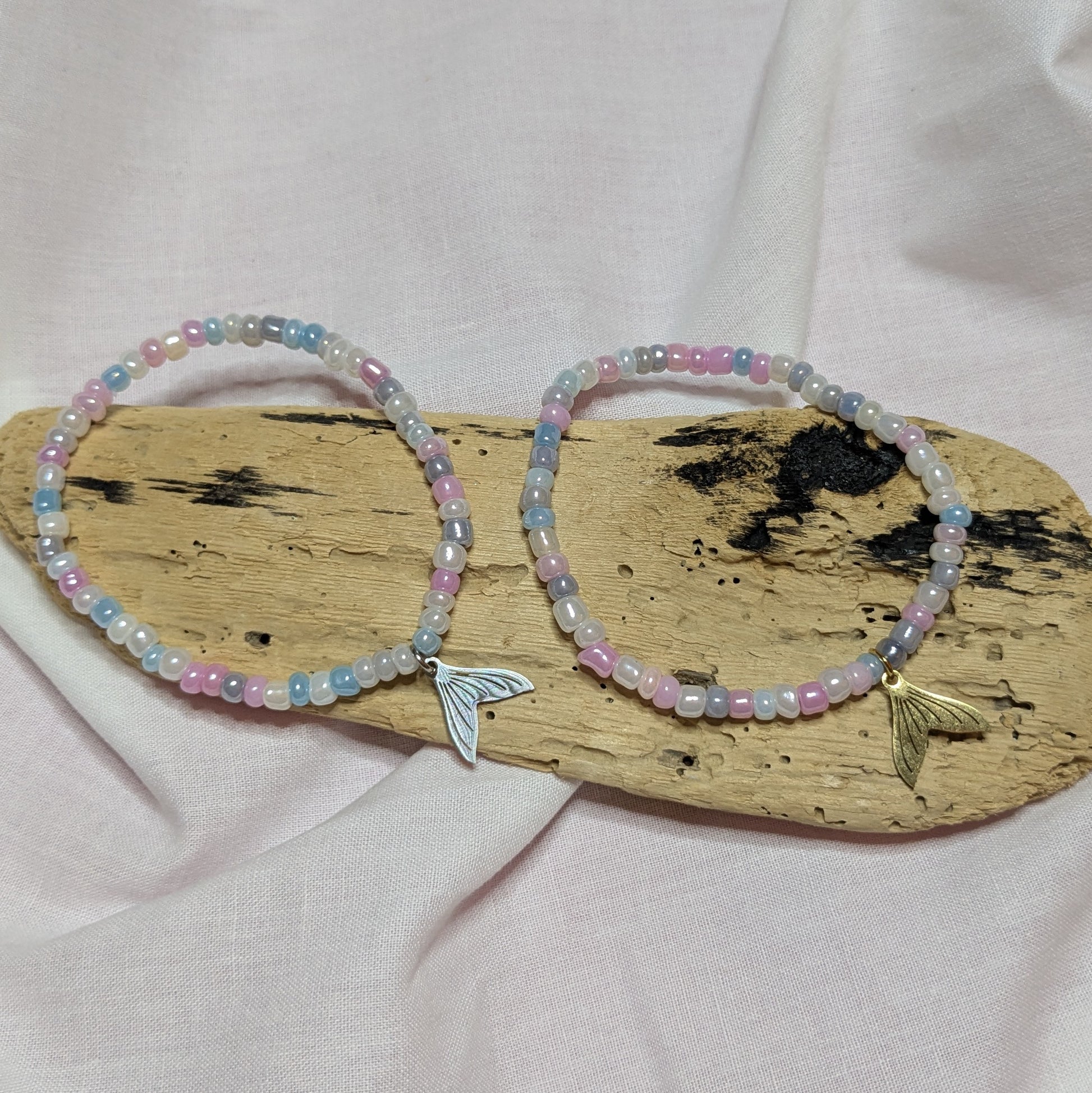 Mermaid tail bracelet feature pastel coloured seed beads and a hypoallergenic stainless steel mermaid tail charm stung on stretch jewellery elastic.