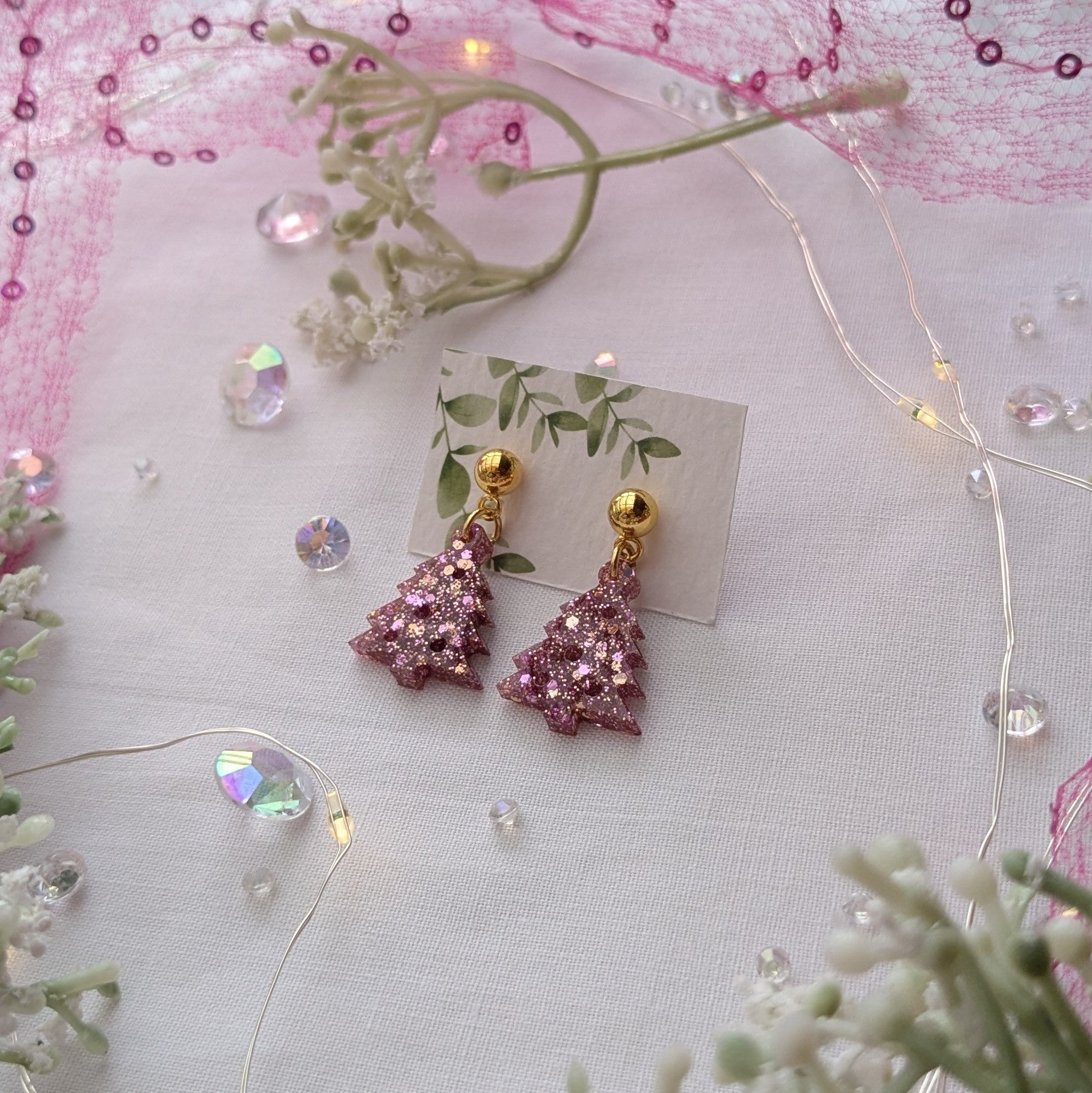 Pink sparkle Christmas tree earrings