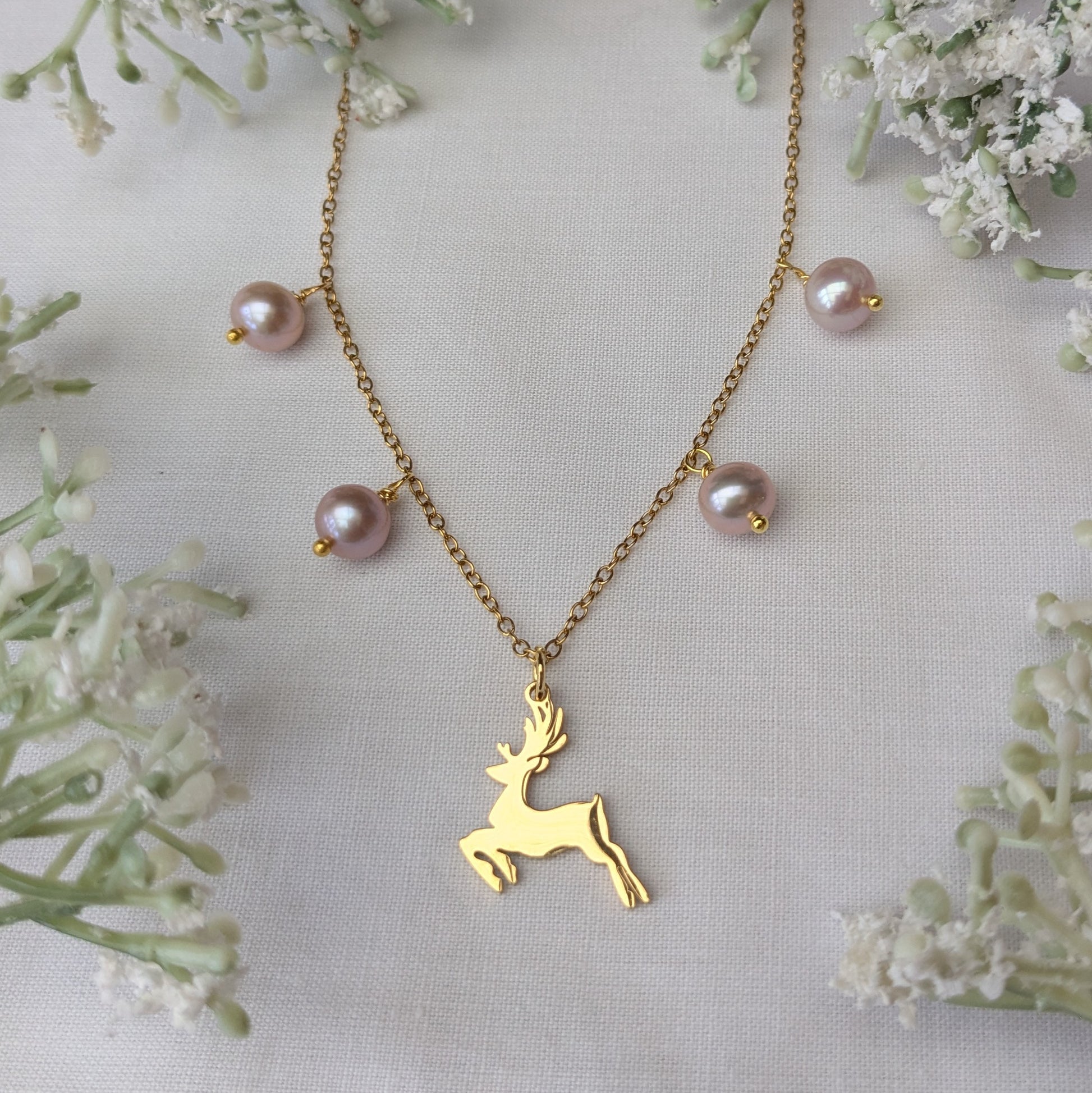 Beautiful freshwater pearls hung on a hypoallergenic gold coloured stainless steel chain with a beautiful reindeer charm.